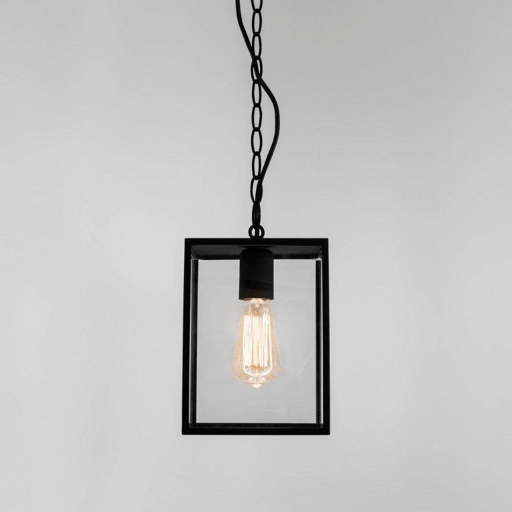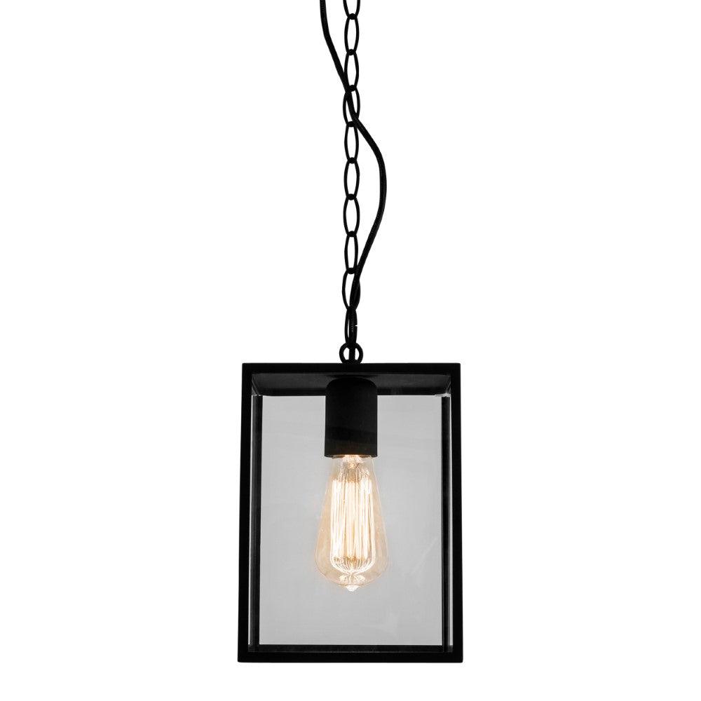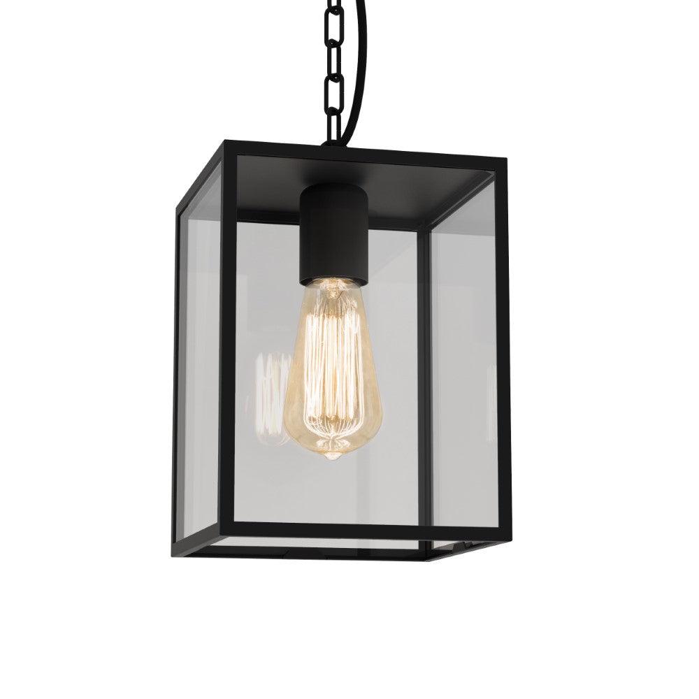 The Astro Homefield 240 Outdoor pendant in textured black provides a contemporary take on a traditional design. Made from steel, the clean lines of the Homefield will enhance any exterior space. This compact pendant looks stylish under a porch to create a welcoming entrance. Ambient light is delivered through clear glass panels and can be dimmed when paired with a dimmable E27 bulb.