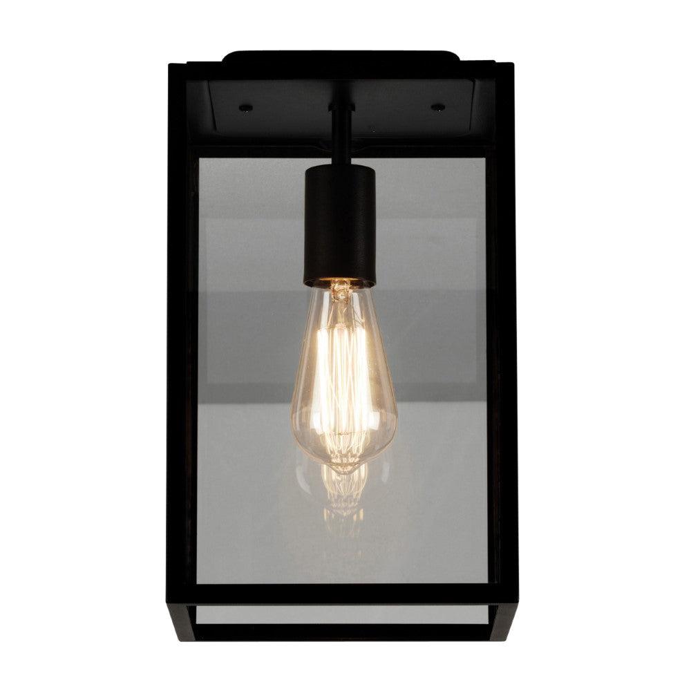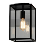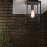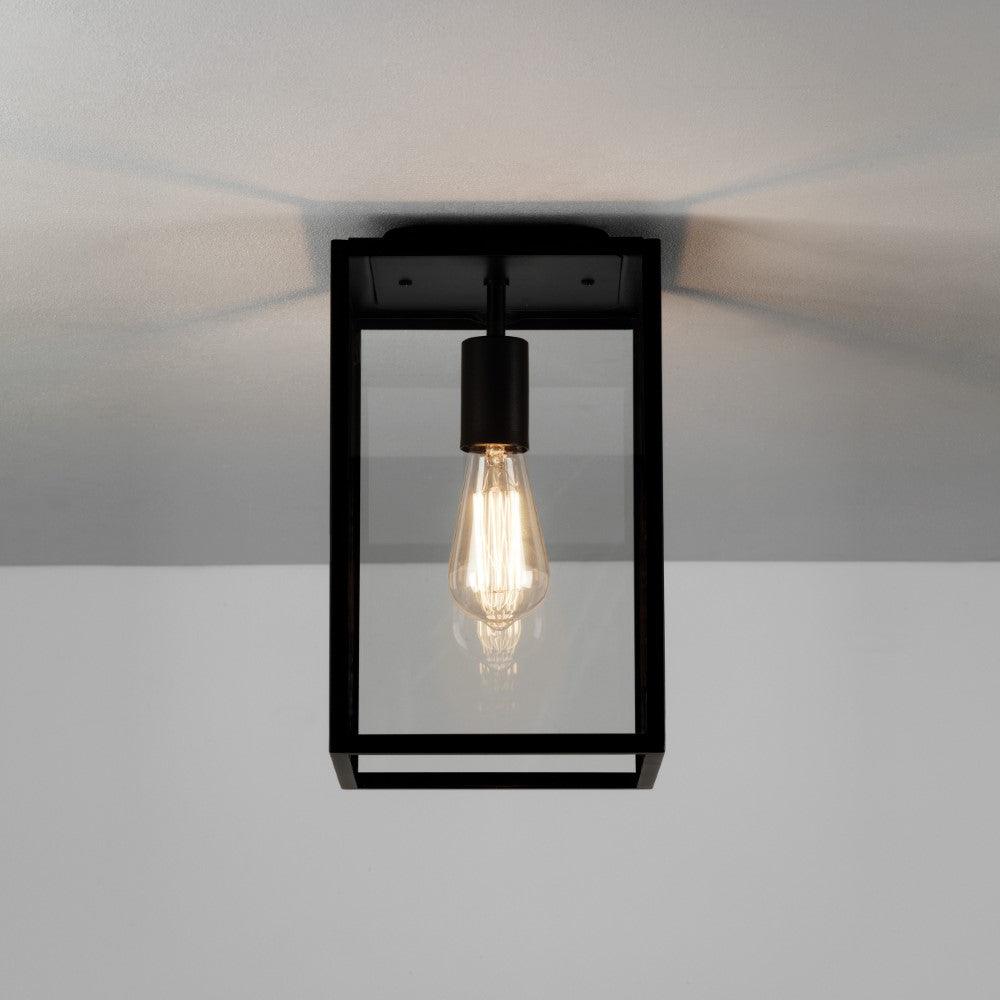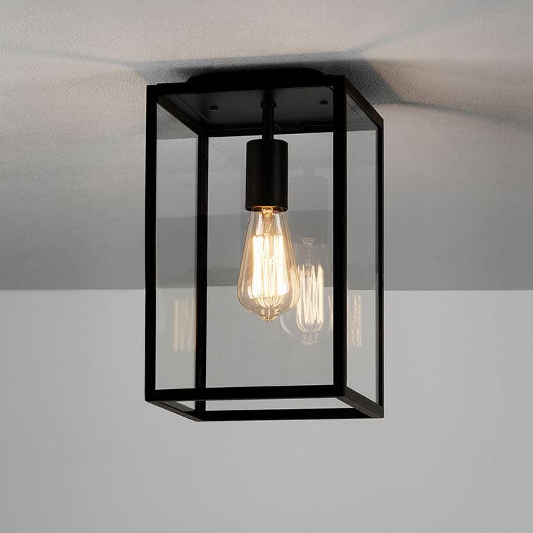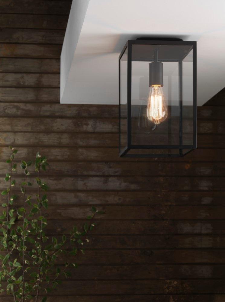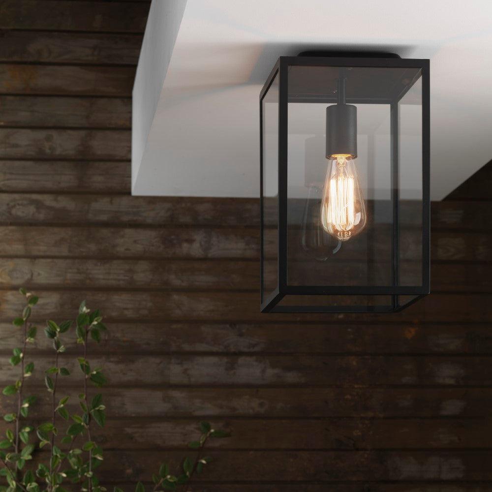 The Astro Homefield Outdoor ceiling light in textured black provides a contemporary take on a traditional design. Made from stainless steel, the clean lines of the Homefield will enhance any exterior space. This large ceiling light looks stylish under a porch to create a welcoming entrance. Ambient light is delivered through clear glass panels and can be dimmed when paired with a dimmable E27 bulb.