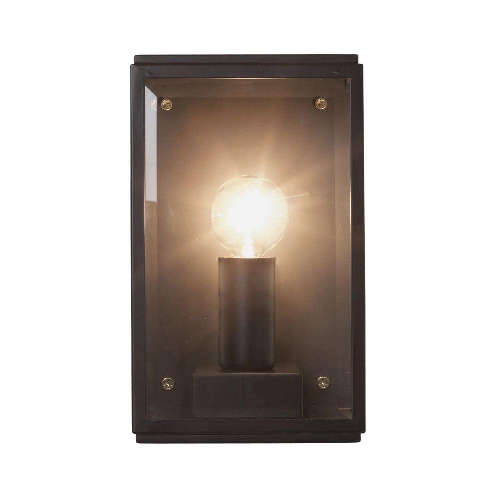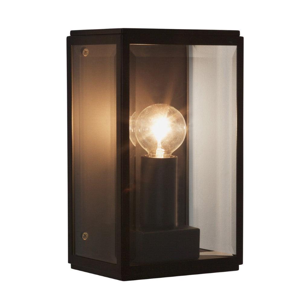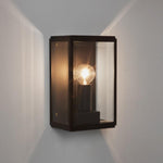 The Astro Homefield 130 Outdoor wall light finished in textured black provides a contemporary take on a traditional design. Made from steel, the clean lines of the Homefield will enhance any exterior wall. This compact wall light is suitable for illuminating exterior walls or creating a warm welcome when placed either side of a front door. Clear glass panels emit soft ambient light that can be dimmed when paired with a dimmable E27 bulb.