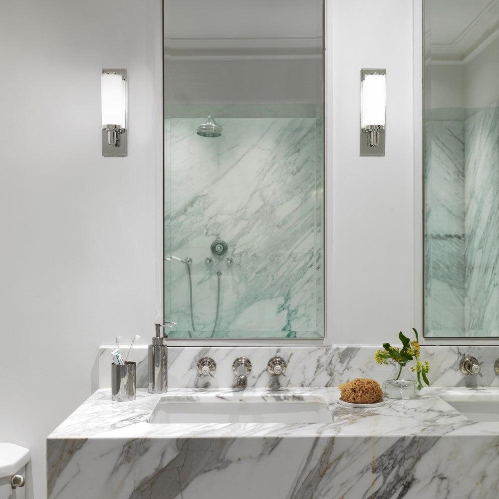 The Astro Verona Bathroom wall light in polished chrome provides a contemporary twist on a traditional design and is made from steel. This small wall light looks great placed either side of a mirror to give real style to any bathroom. Soft ambient light glows through the opal glass diffuser. The Verona is dimmable when paired with a dimmable E14 bulb.