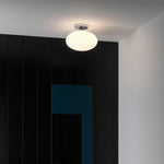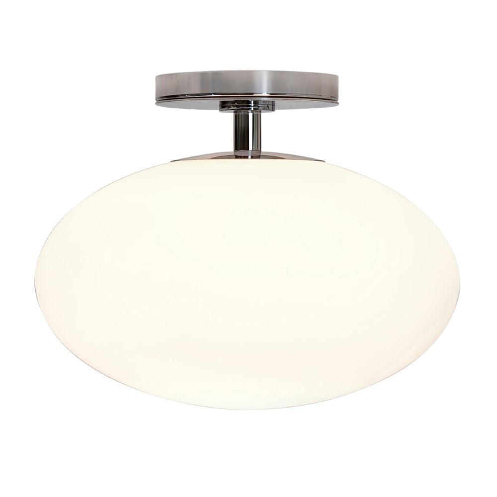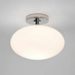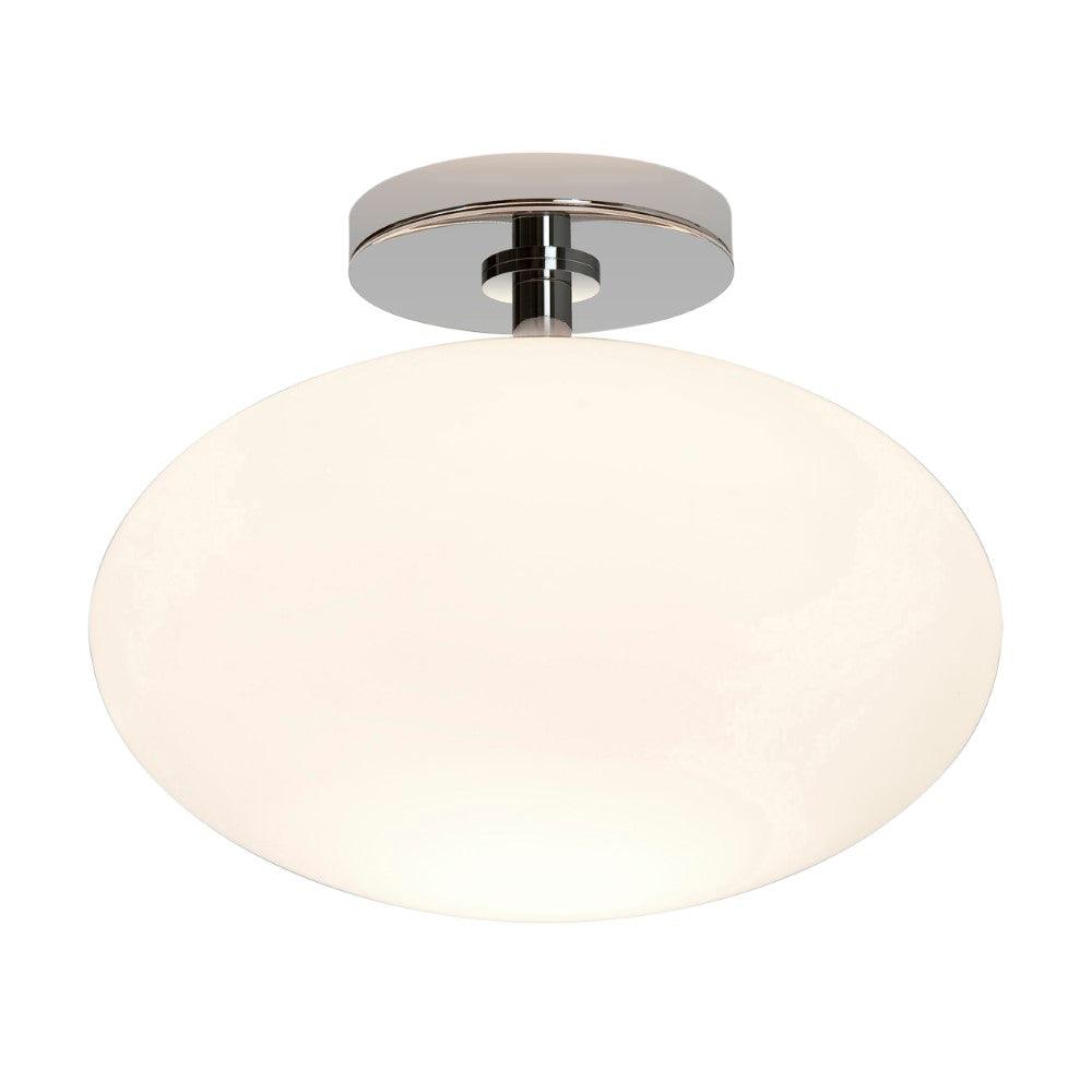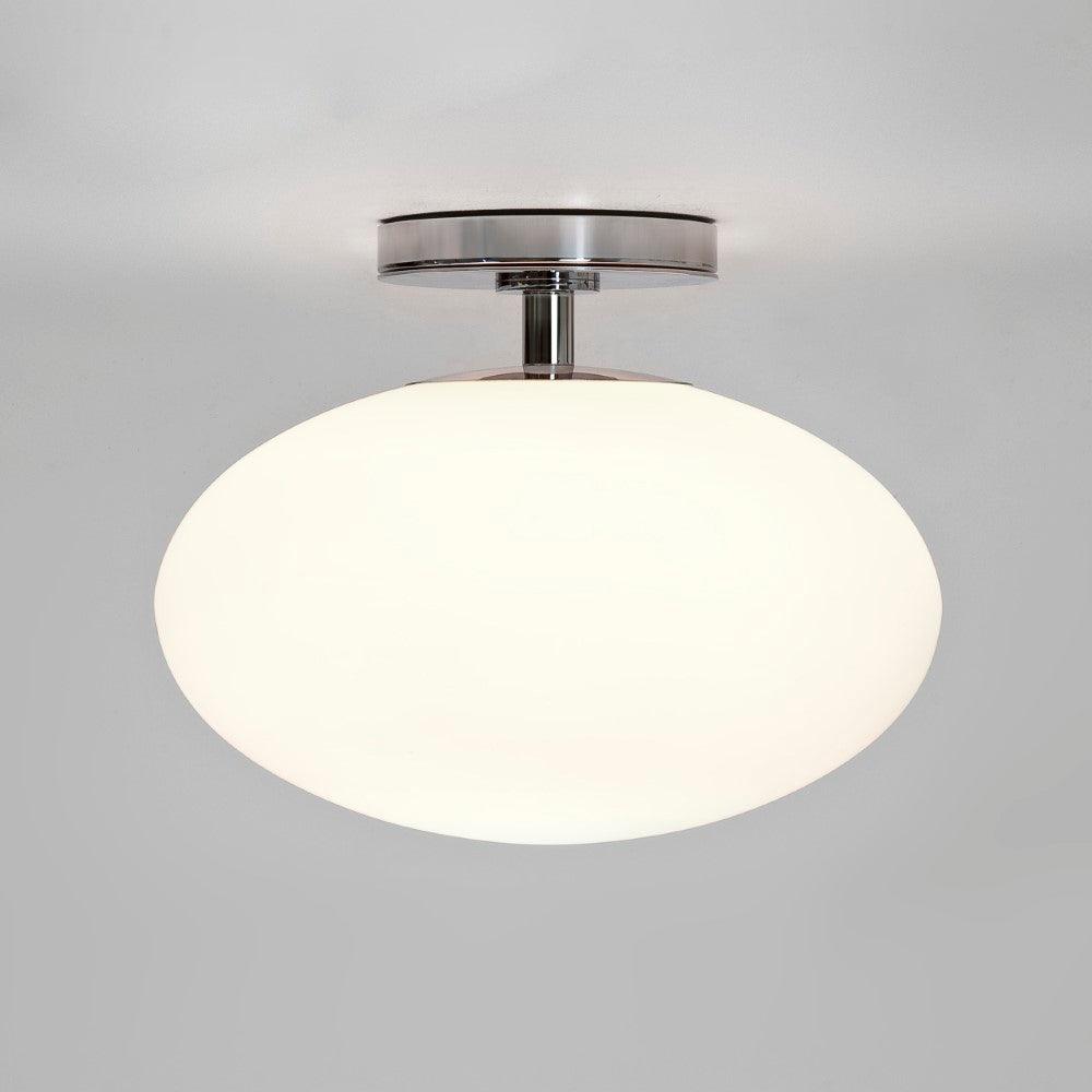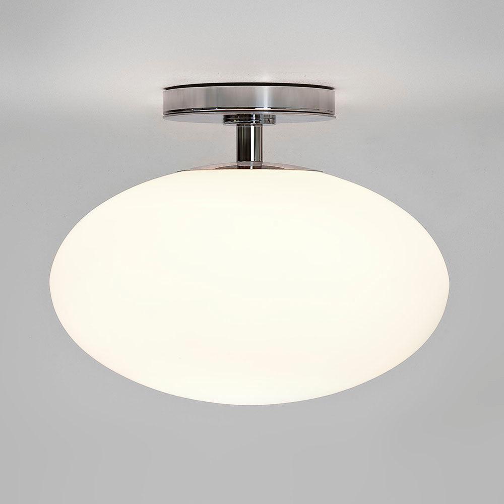 The Astro Zeppo Bathroom ceiling light finished in polished chrome features a contemporary design made from steel. This large ceiling light is perfect for adding a touch of style to any bathroom. Soft ambient light is delivered through the frosted blown glass diffuser, which can be dimmed when paired with a dimmable E27 bulb. Designed for ceiling mounting only.