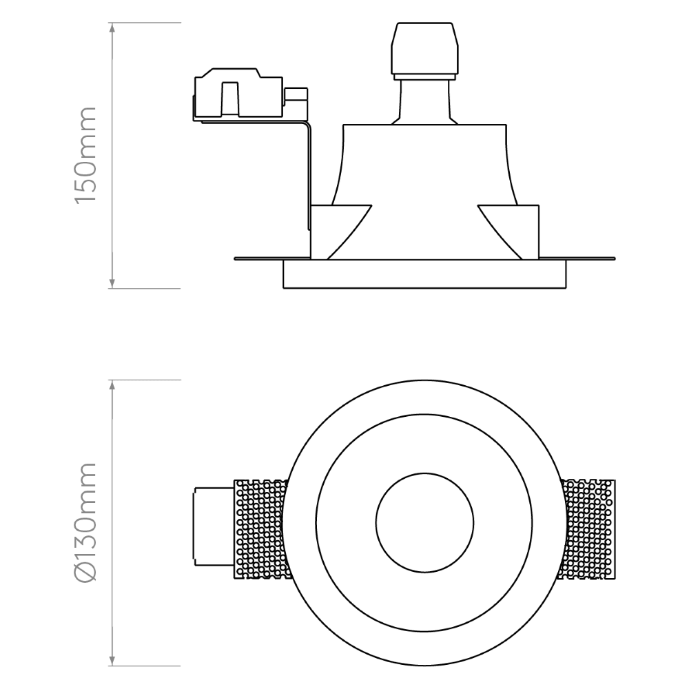 • The Blanco does not come with a bulb. You will require 1 x 6W Max LED GU10 MR16 shaped bulb. A cut-out diameter of 131mm and a recess depth of 150mm is required. The Blanco must be installed after plastering.