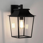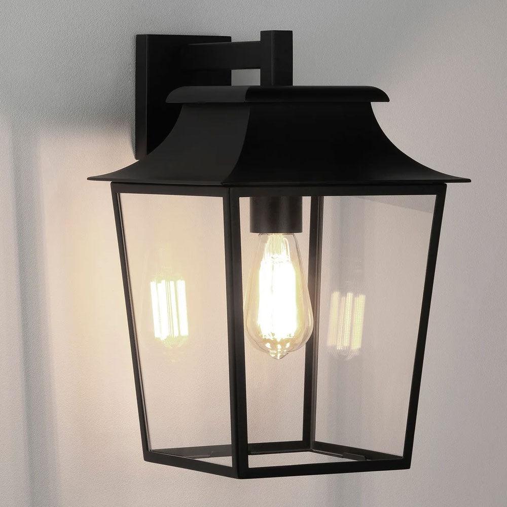The Astro Richmond Lantern 254 Outdoor wall light finished in Textured Black features a contemporary twist on a traditional design and is made from steel. This large wall light looks elegant either side of a front door to give a warm, welcoming entrance. Ambient light shines through clear glass panels, which can be dimmed when paired with a dimmable E27 bulb. Designed for wall mounting vertically.