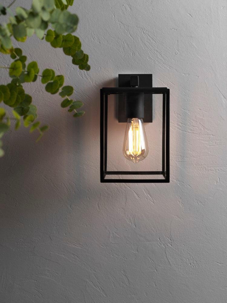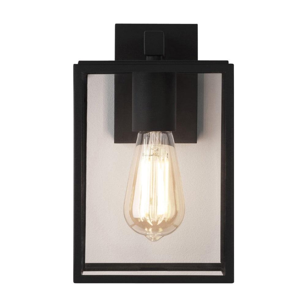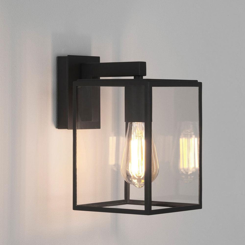 The Astro Box Lantern 270 Outdoor wall light finished in textured black features a classic design made from steel. This large wall light is perfect for illuminating outdoor walls or providing a warm welcome when used either side of a front door. Clear glass panels emit ambient light that can be dimmed if paired with a dimmable E27 bulb.