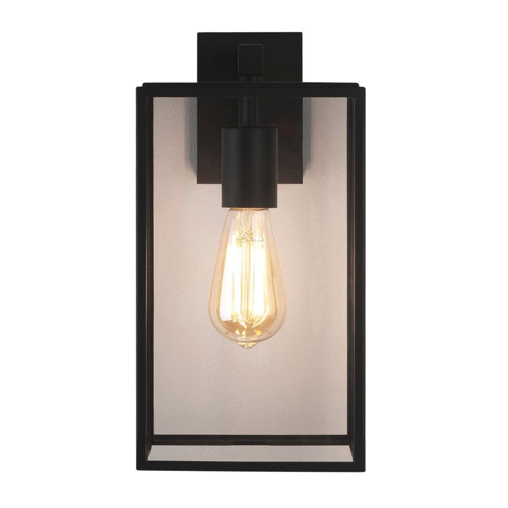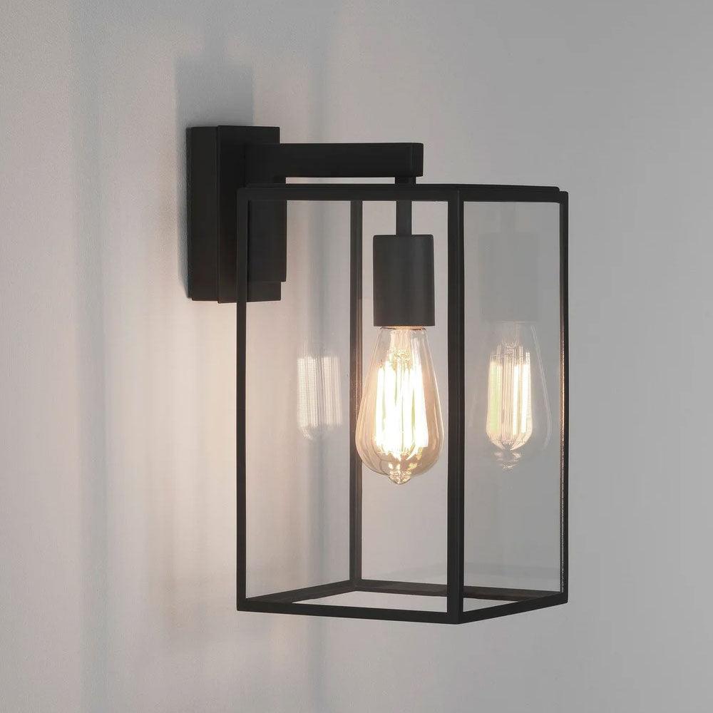 The Astro Box Lantern 350 Outdoor wall light finished in textured black features a classic design made from steel. This large wall light is perfect for illuminating outdoor walls or providing a warm welcome when used either side of a front door. Clear glass panels emit ambient light that can be dimmed if paired with a dimmable E27 bulb.