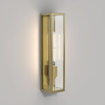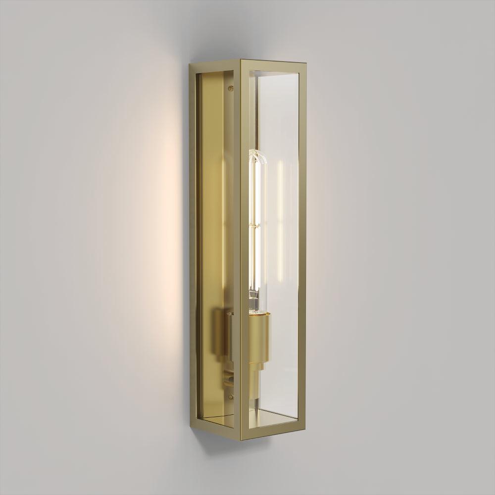 The Astro Harvard Outdoor wall light finished in natural brass is a stylish and contemporary design made from solid brass. This tall wall light is perfect for mounting either side of a front door for a welcoming entrance. Sparkling ambient light shines through clear glass panels, which can be dimmed when paired with a dimmable E27 bulb.