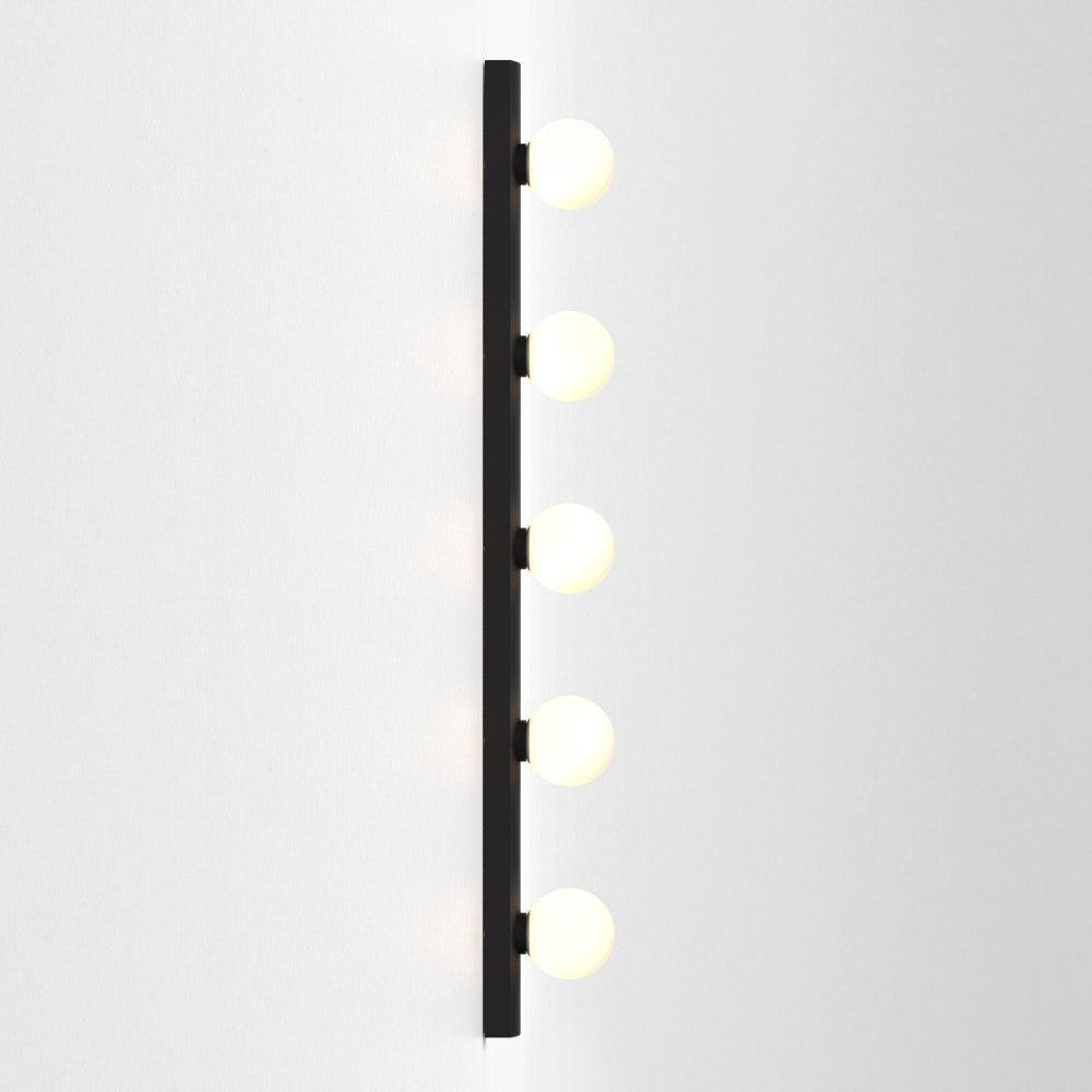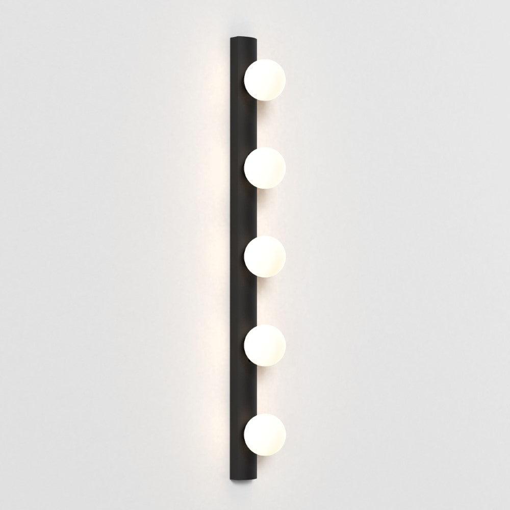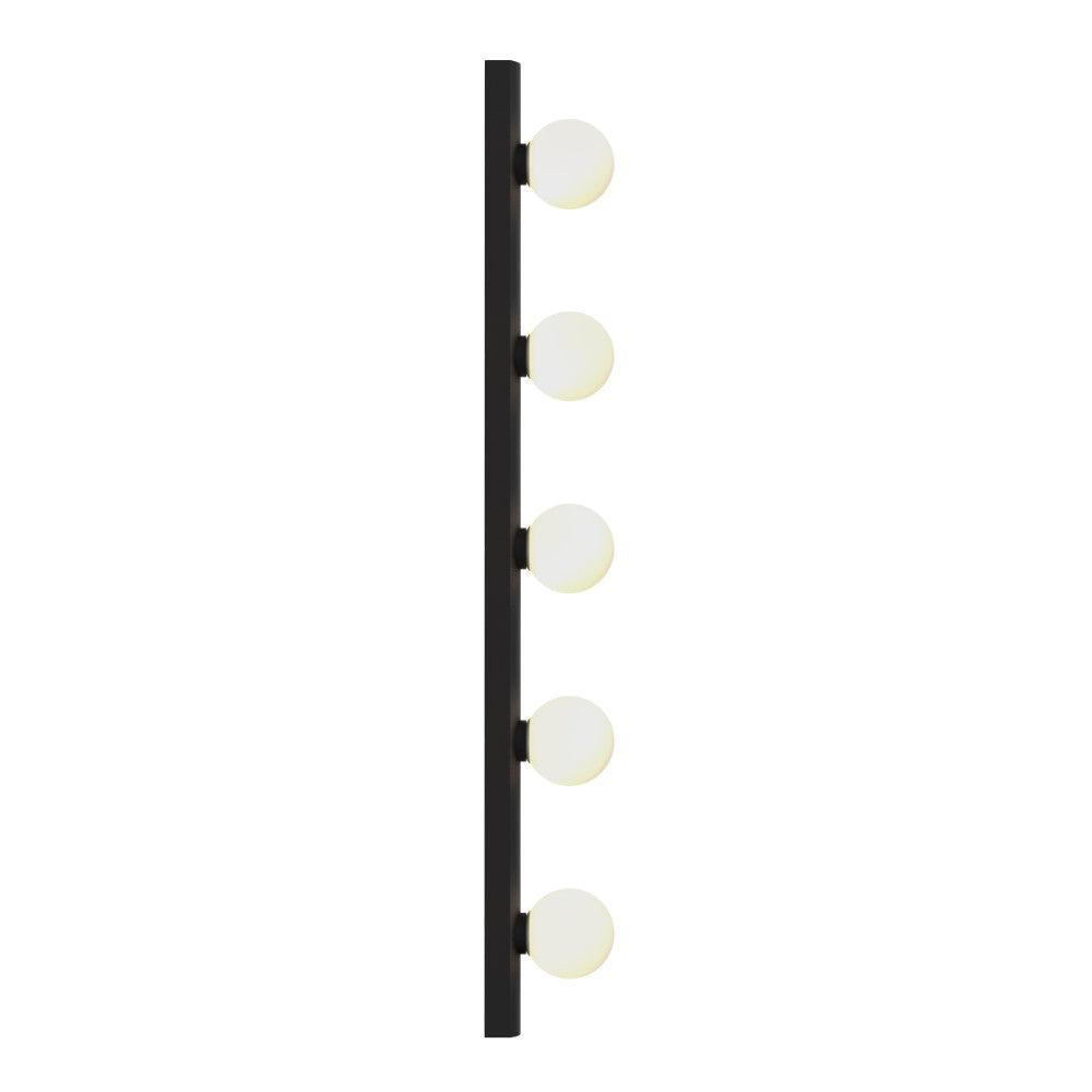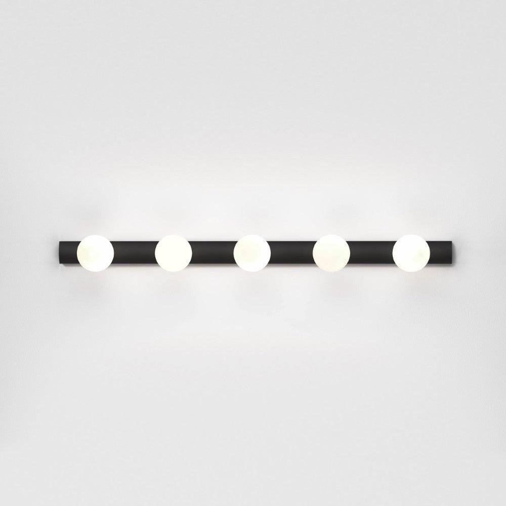 The Astro Cabaret 5 II bathroom wall light in matt black is a contemporary take on the classic Hollywood mirror made from steel. This timeless wall light works great in bathrooms or dressing rooms positioned both horizontally or vertically around a mirror. It provides bright, even illumination through blown glass globes. This light is dimmable when paired with a dimmable G9 bulb.