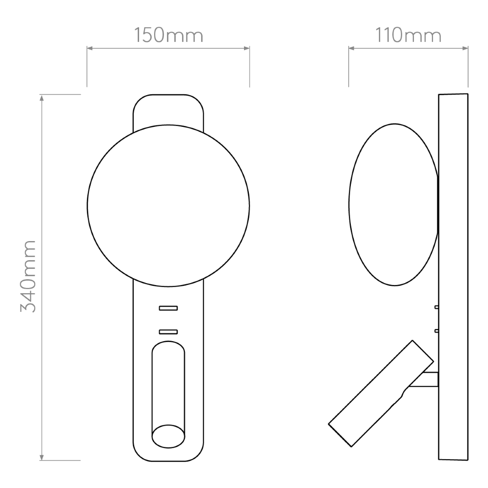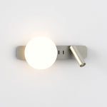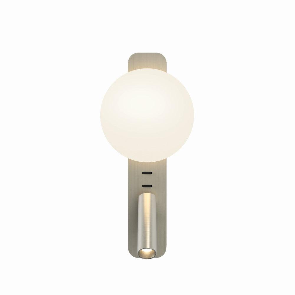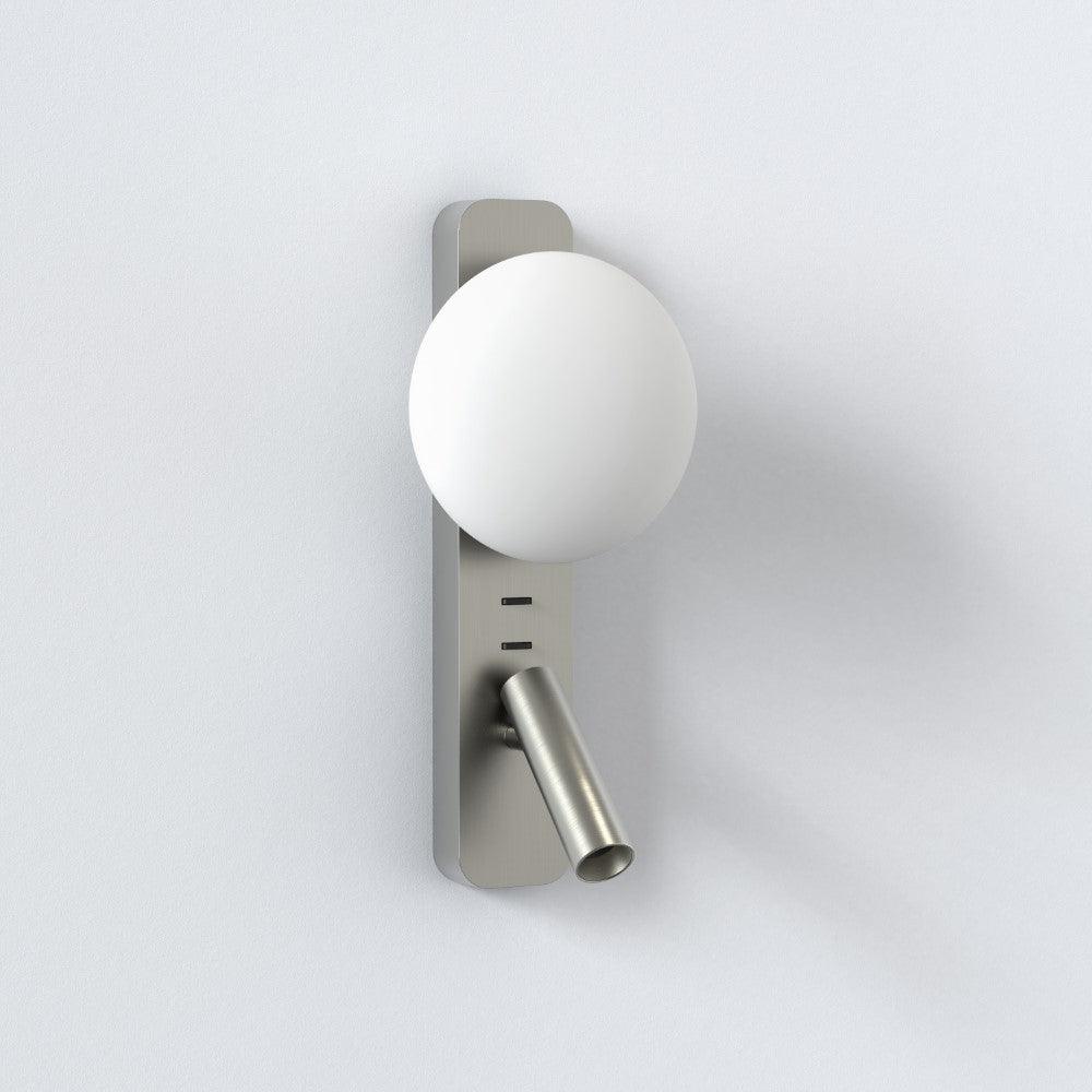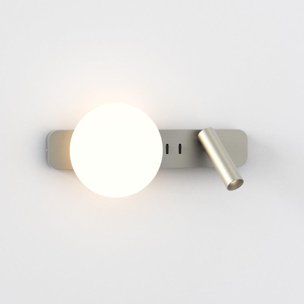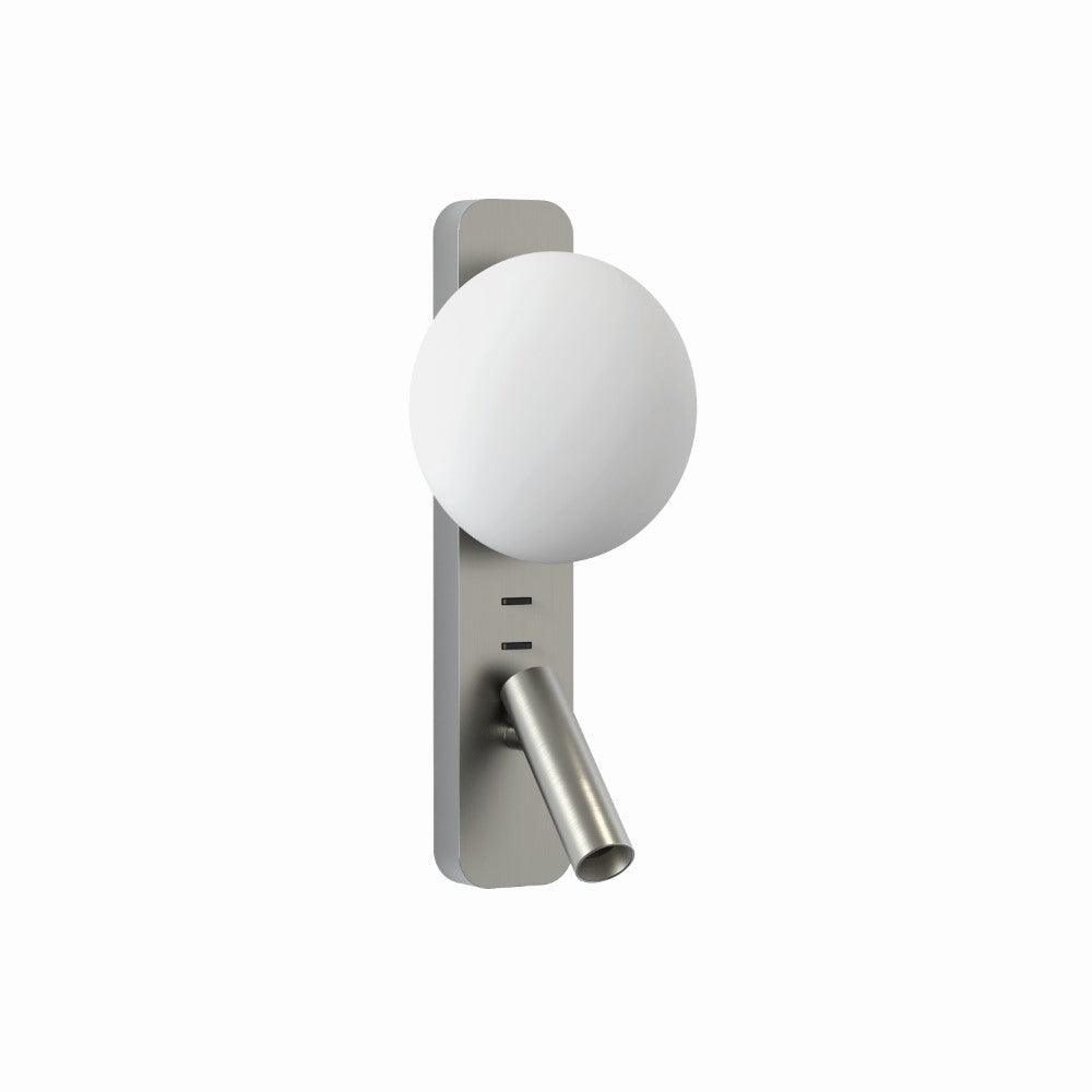 The Astro Zeppo Combination Reading Light in Matt Nickel is a unique contemporary design made from aluminium. Featuring two individually switched light sources, a glowing flattened globe for ambience and a directional spot for reading. This slender reading light is designed for use either side of a bedhead. The glowing glass diffuser provides soft ambient light, while the LED spotlight provides low glare directional light for reading. Horizontal or vertical mounting on a wall.