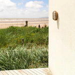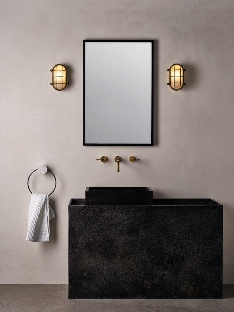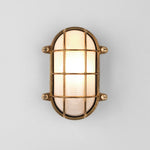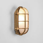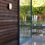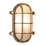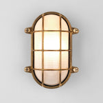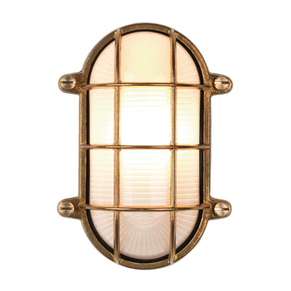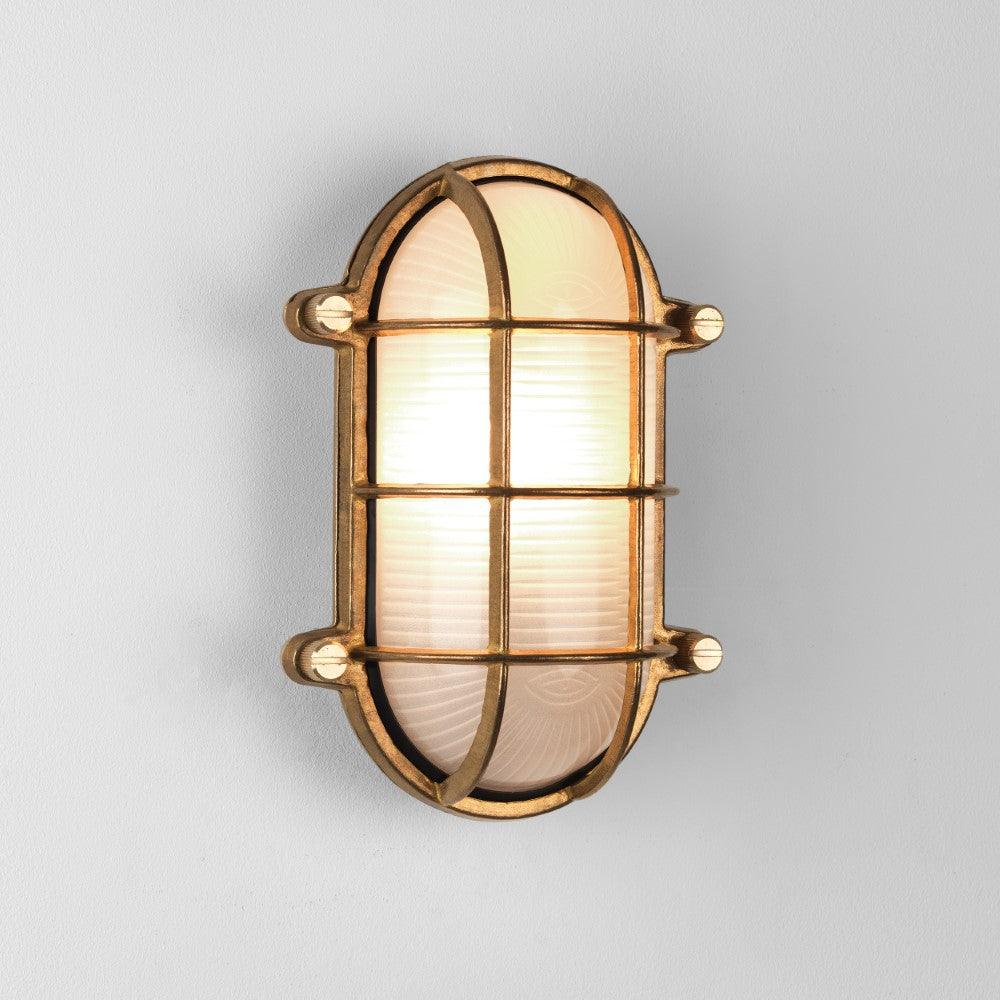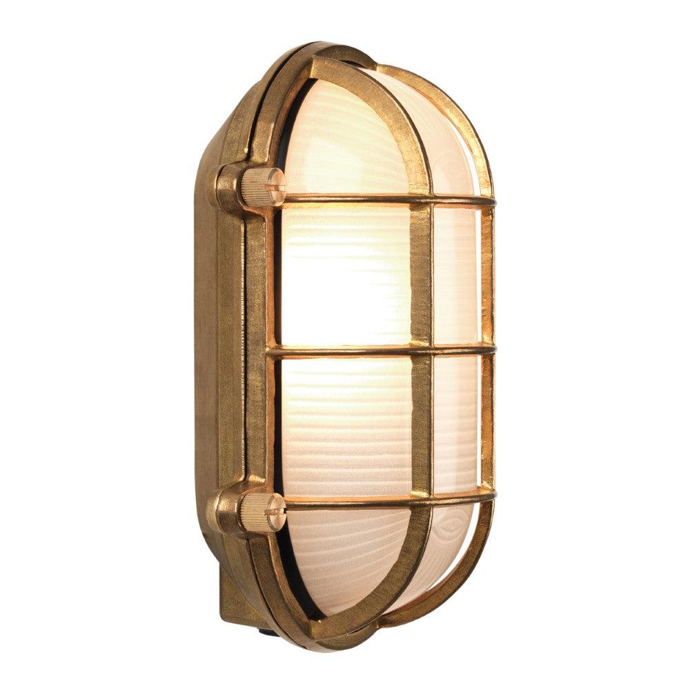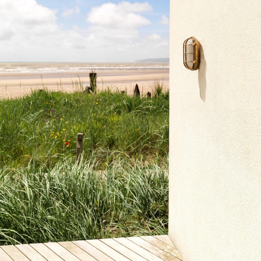 The Astro Thurso Oval wall light finished in coastal natural brass is a modern take on a traditional bulkhead design and is made from solid brass for use in challenging coastal applications. This wall light looks stylish in any outdoor setting on a wall or ceiling. Soft ambient light spreads through a frosted glass diffuser, which can be dimmed when paired with a dimmable bulb. Thurso is designed for installation on a wall or ceiling.