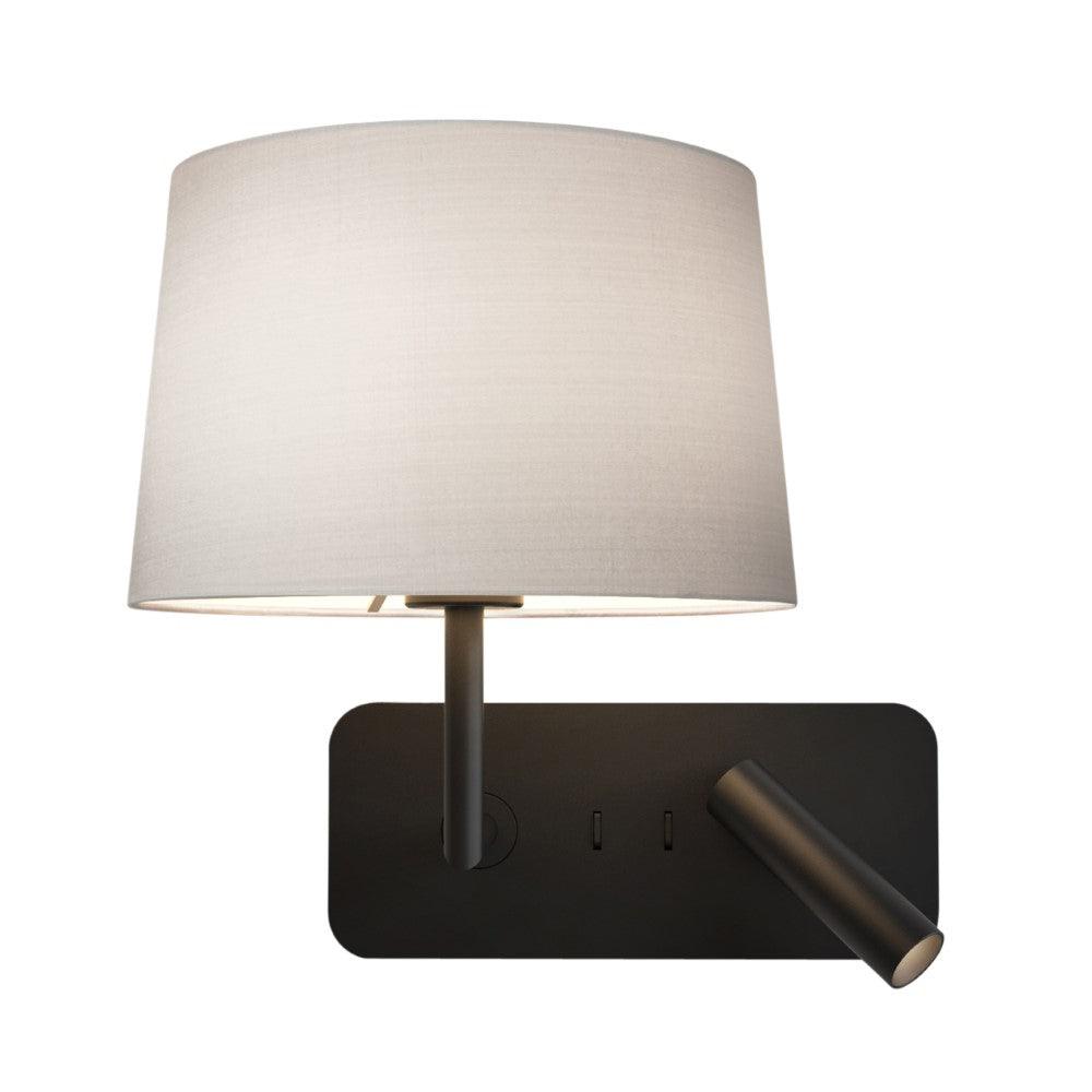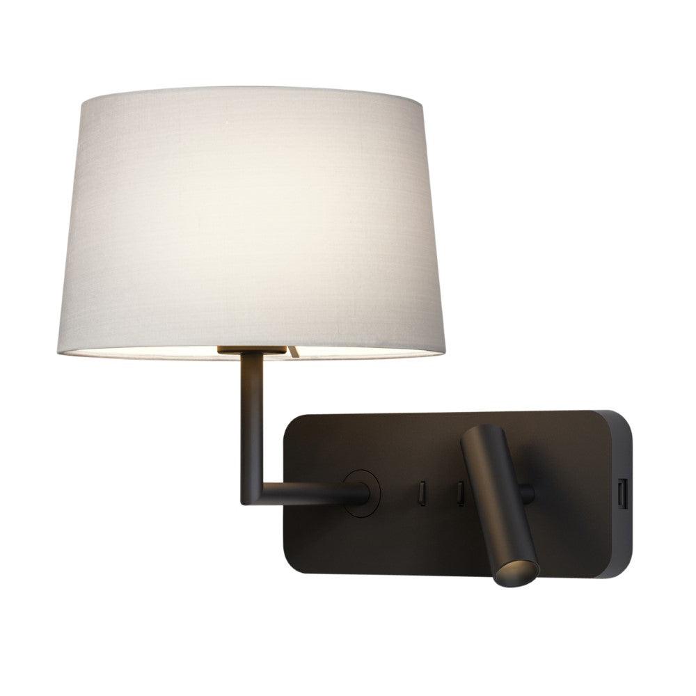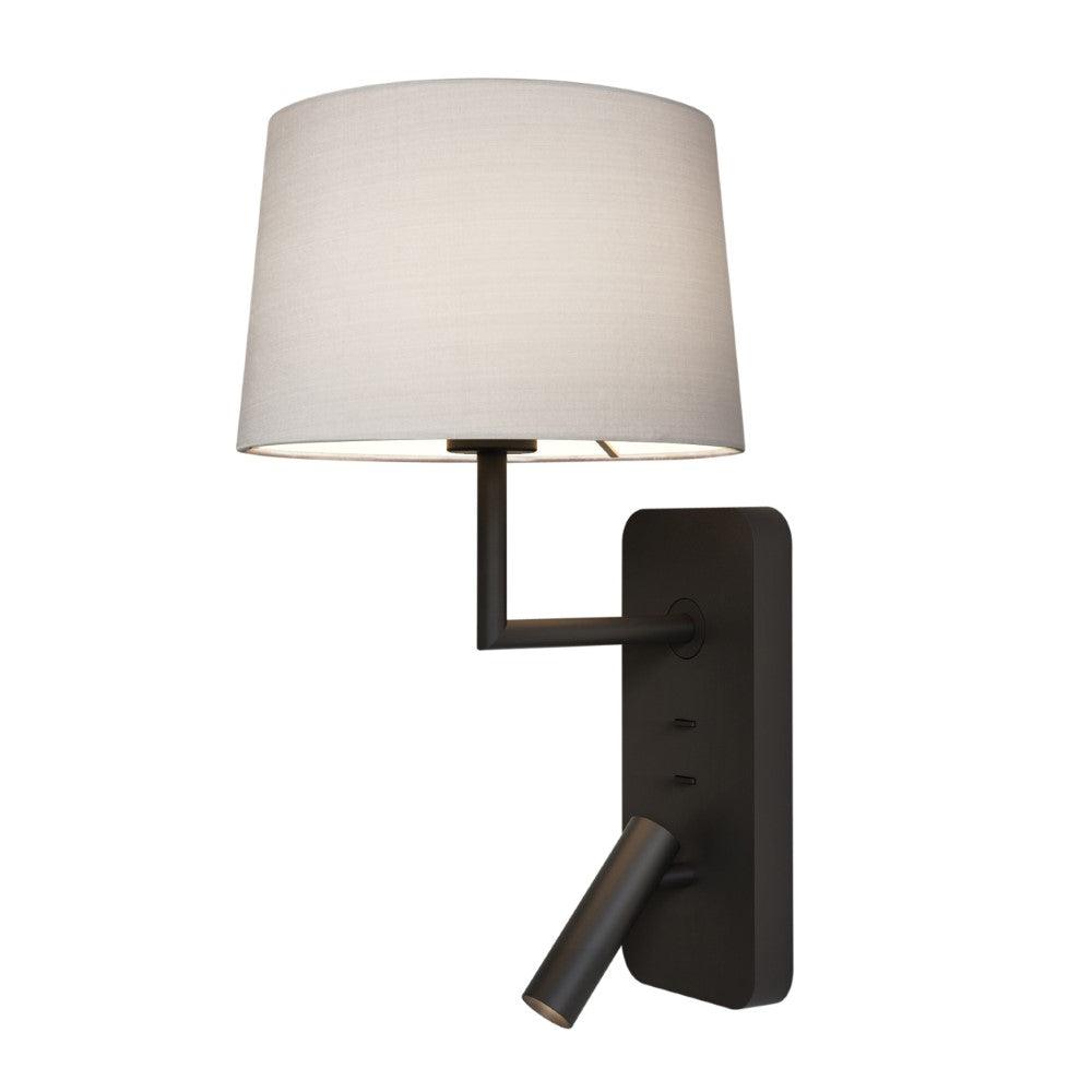 The Astro Side by Side Grande USB Reading Light in Matt Black is a unique contemporary design cast in zinc. Featuring a handy USB socket and two individually switched light sources, a shaded E27 lamp and an LED reading light. Shade supplied separately. This large reading light works great by the bedside. It offers convenient USB charging alongside the soft glow of the shaded lamp and the low glare, fully adjustable reading light. Designed for wall mounting horizontally or vertically.