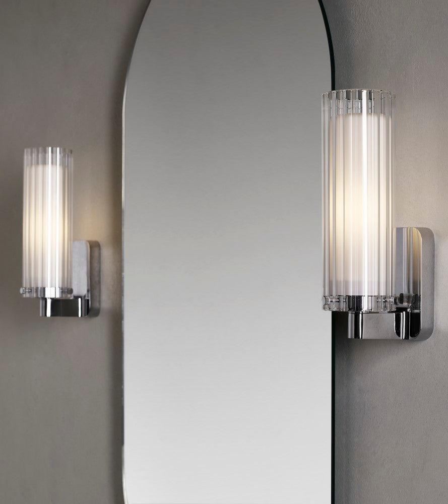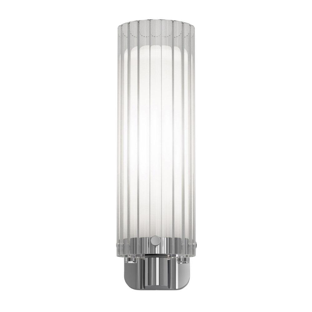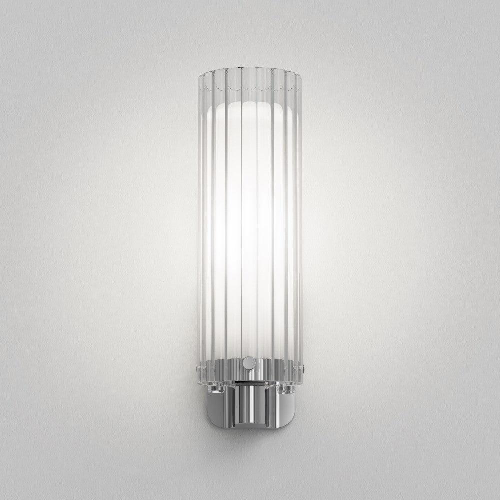 The Astro Ottavino Wall in polished chrome is a striking bathroom wall light cast in zinc. This elegant, decorative wall light works great either side of a bathroom mirror. It provides sparkling ambient light through a fluted cylindrical glass. Ottavino is dimmable when paired with a dimmable LED E14/SES bulb and is designed for wall mounting.