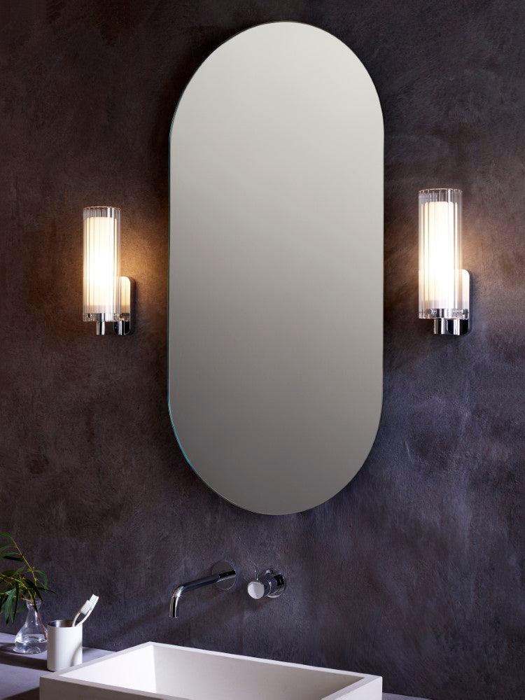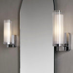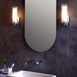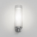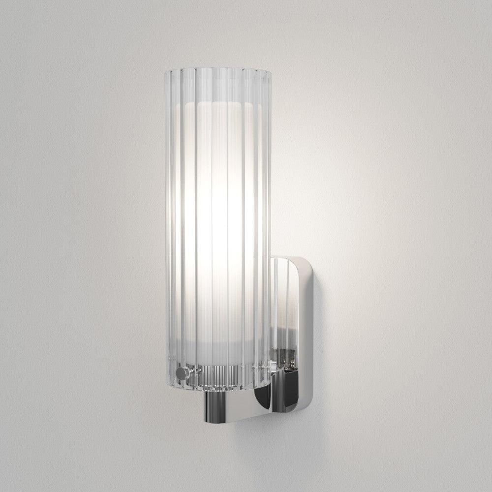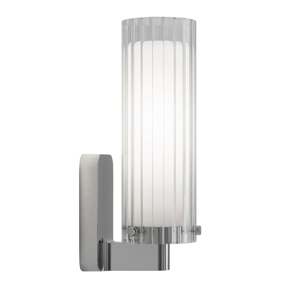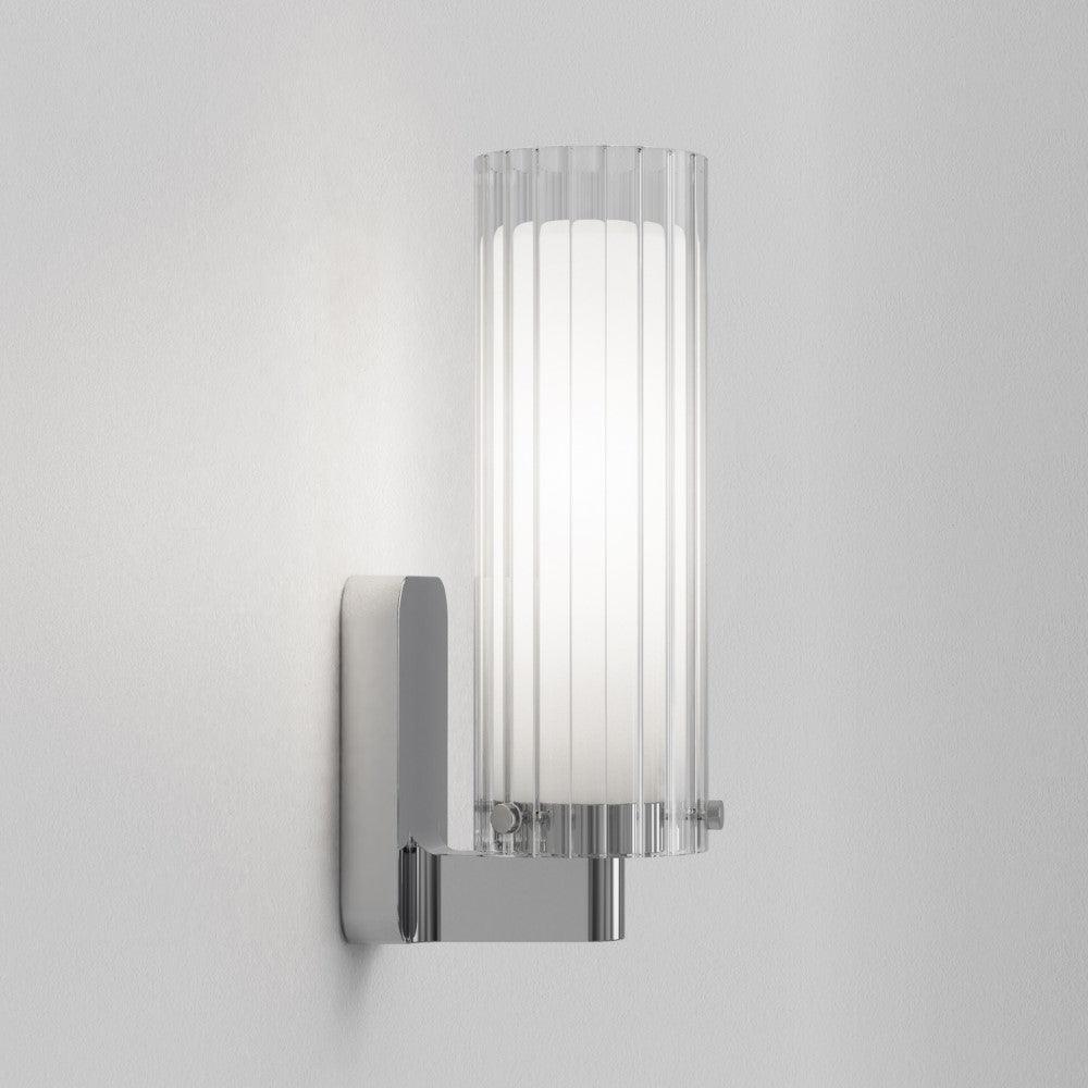 The Astro Ottavino Wall in polished chrome is a striking bathroom wall light cast in zinc. This elegant, decorative wall light works great either side of a bathroom mirror. It provides sparkling ambient light through a fluted cylindrical glass. Ottavino is dimmable when paired with a dimmable LED E14/SES bulb and is designed for wall mounting.