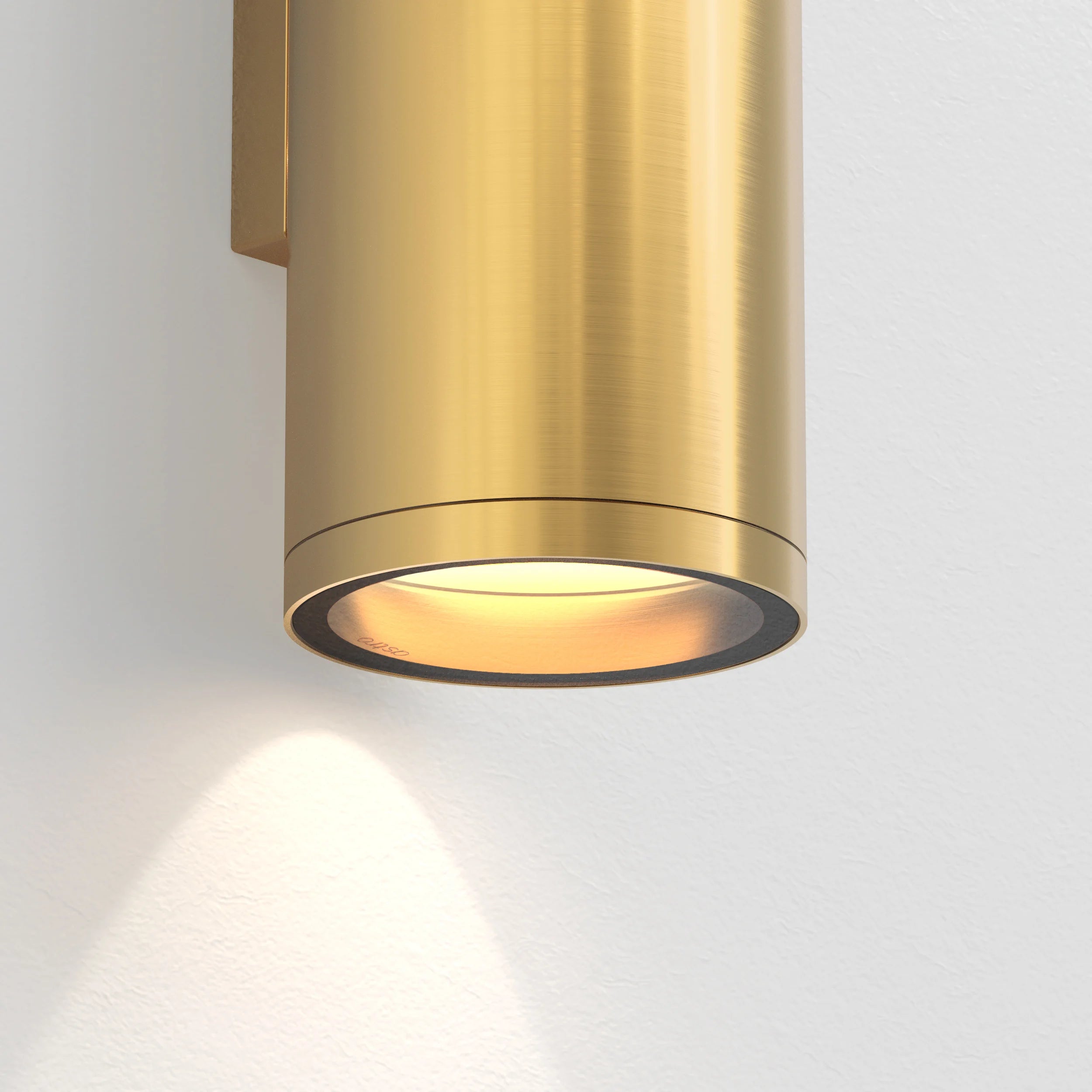 The Astro Ava 200 wall light in PVD brushed brass is an architectural and contemporary wall light. This cylindrical wall light is perfect for use either side of a front door, or mounted in rows to illuminate outdoor areas. The Ava provides a striking arc of light in a singular direction up or down a wall. Offering a downwards wash of light to highlight the surface below, the brushed brass appearance provides a tougher finish which is heat resistant, resistant to scratches and offers elevated corrosion defence. Easy to clean and maintain, this is a timeless exterior wall light that retains its stylish appearance