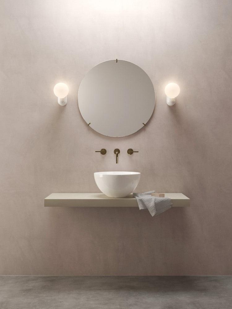 With its glossy white ceramic base and glass shade, Lyra adds warm, comfortable task lighting to any modern bathroom wall. Its sleek design makes it an ideal choice for mounting on one or both sides of the mirror.