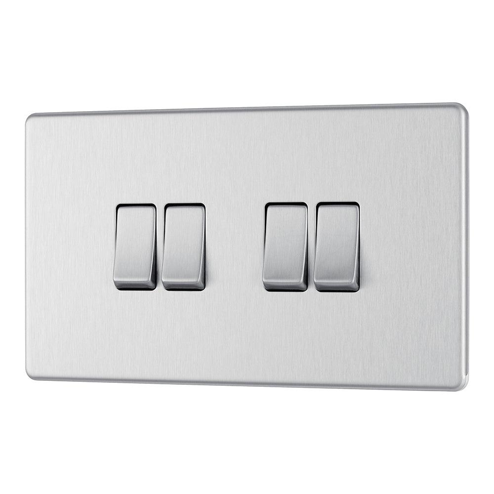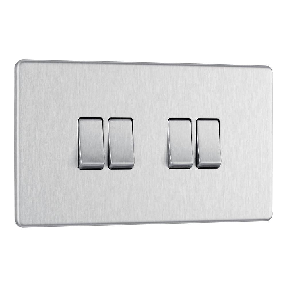 The BG FBS44 is a 4 Gang Light Switch made from high quality components, in a sleek and stylish brushed steel finish.
