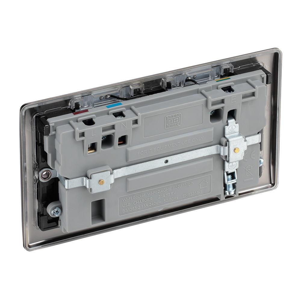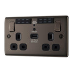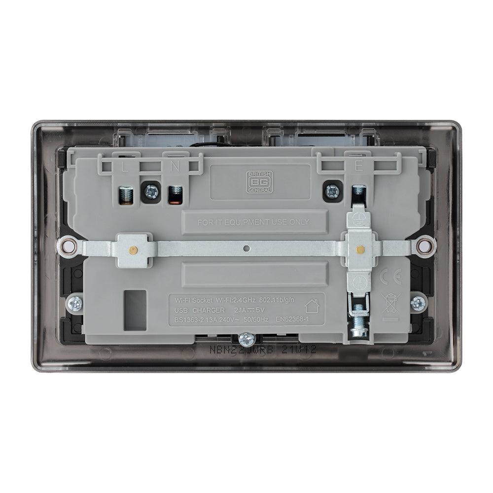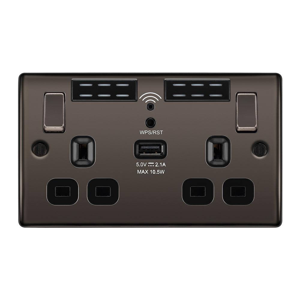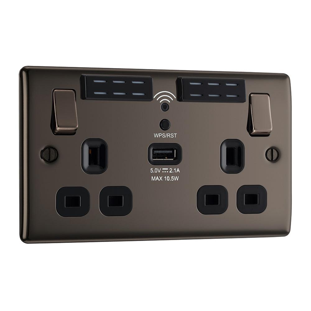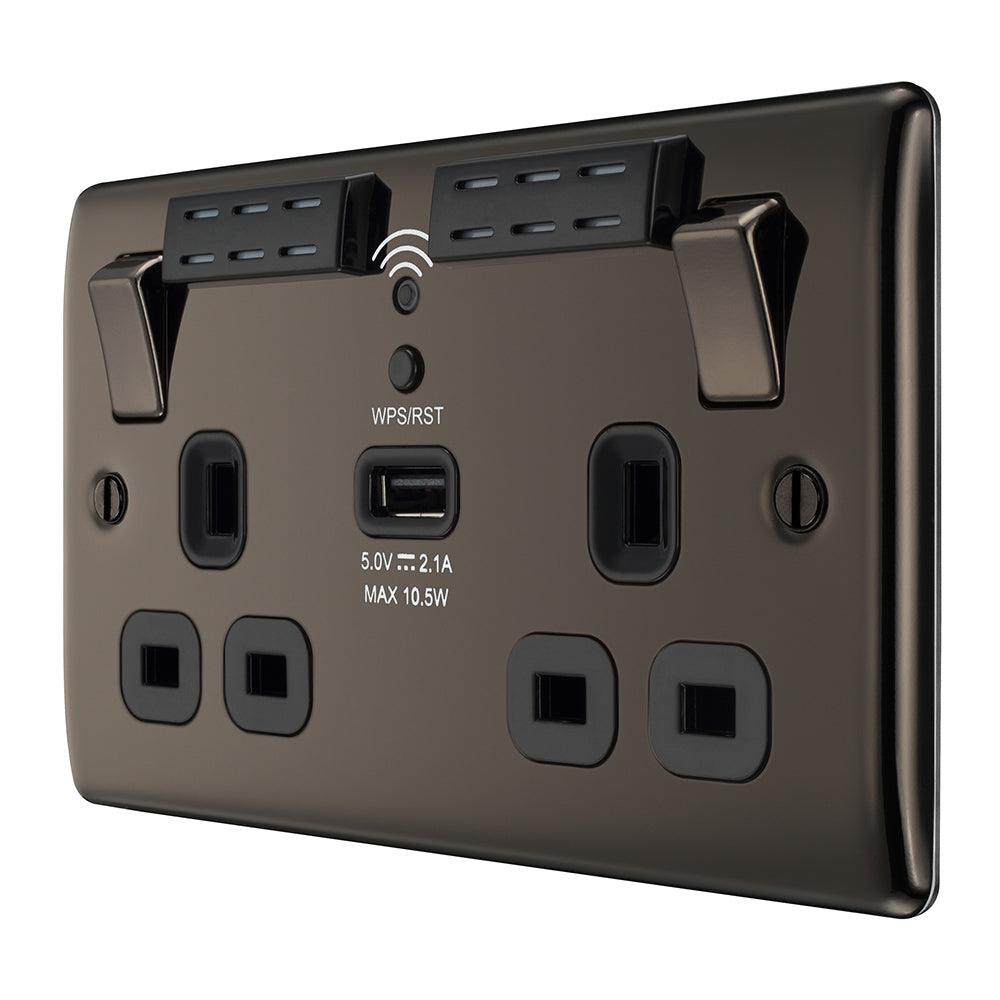 BG NBN22UWRB Black Nickel Double Switched 13A Socket with Wifi Extender + USB Charging - 1X USB Socket (2.1A)