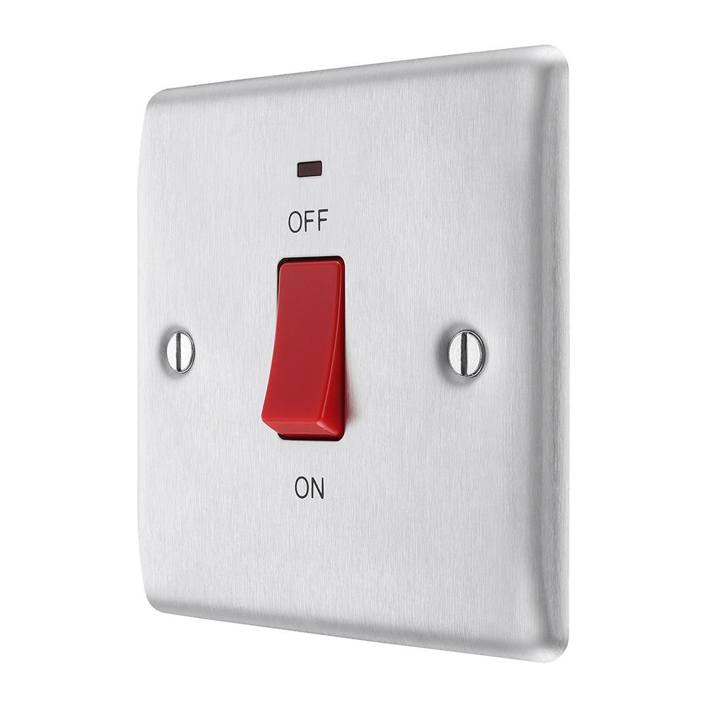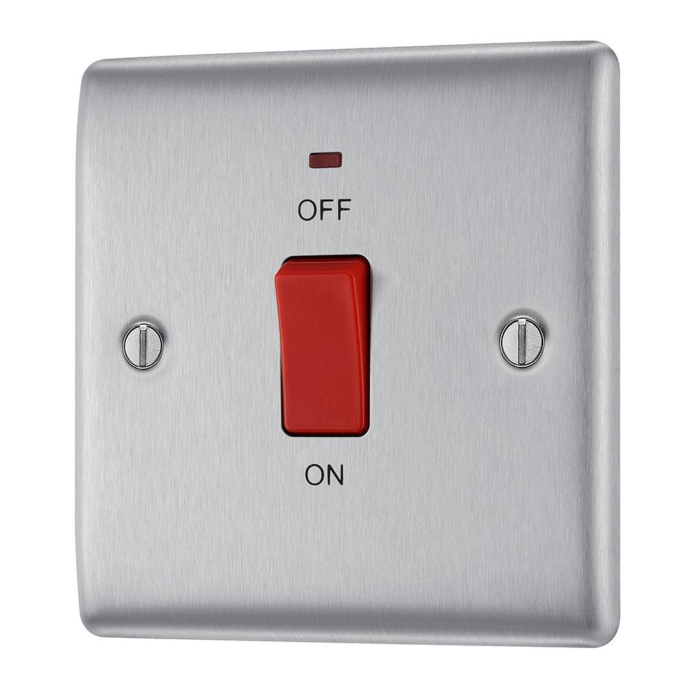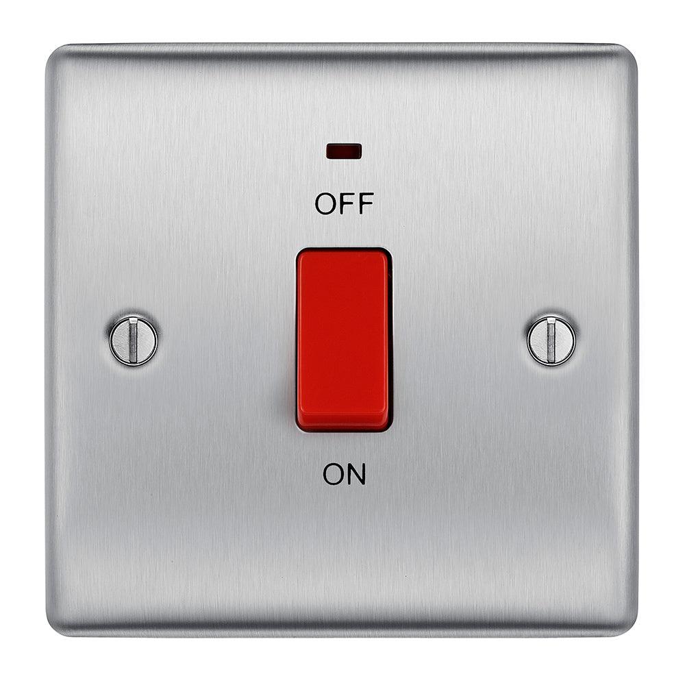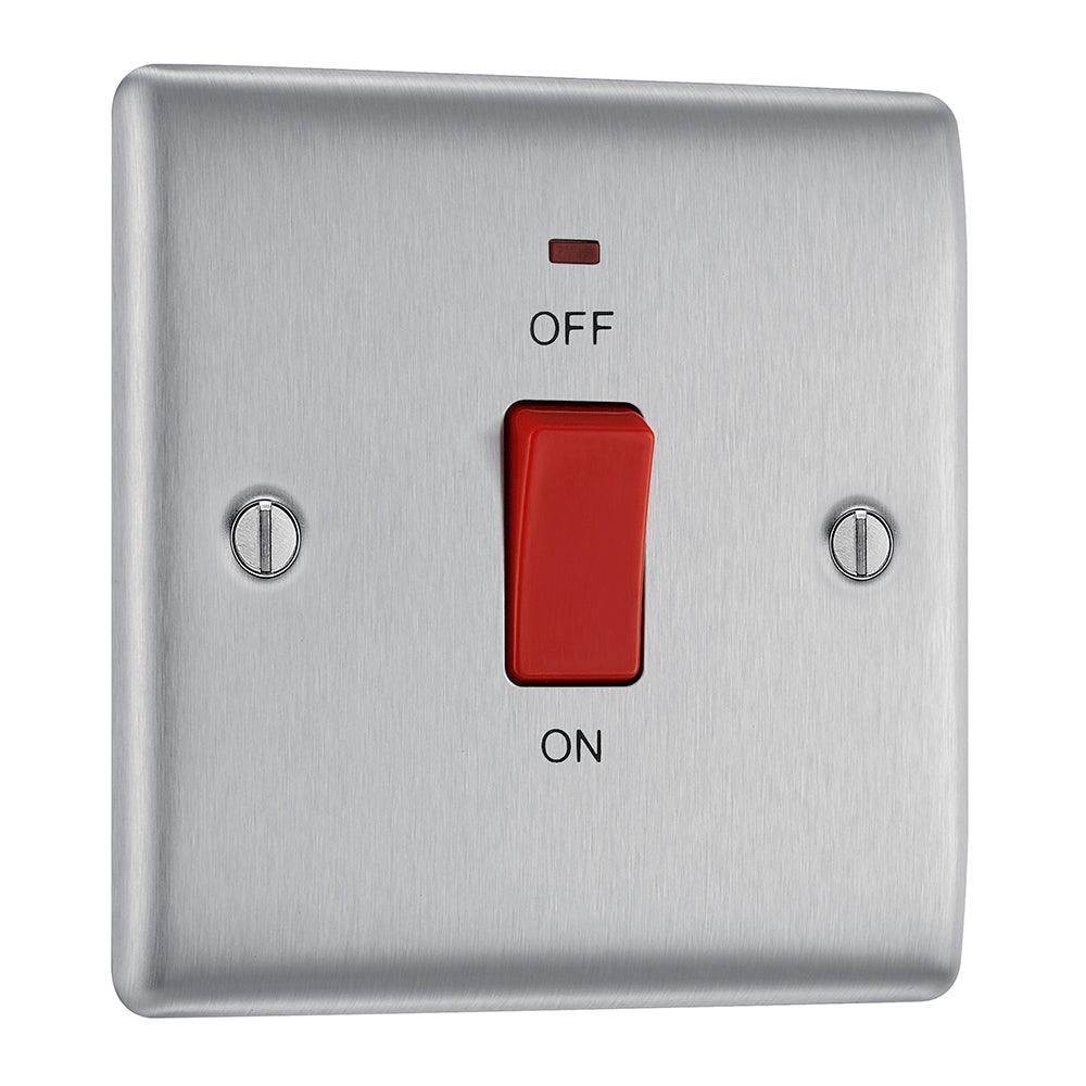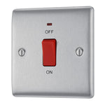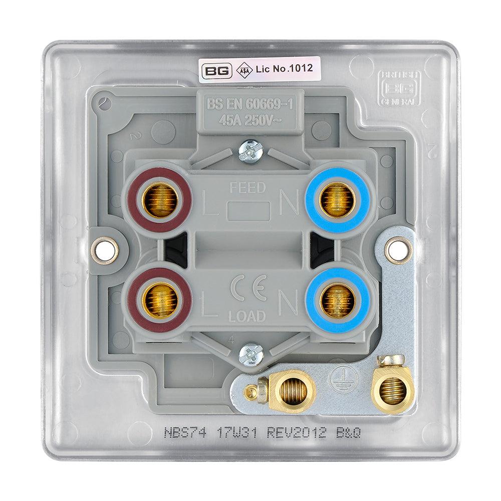 The BG NBS74 is a 45A Square Cooker Control Unit with Neon made from high quality components, in a sleek and stylish brushed steel finish.