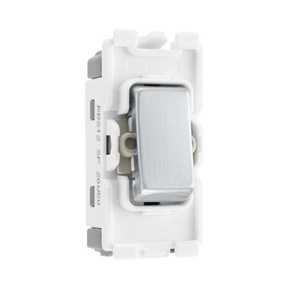 The BG R13 is a Single Pole 2 Way 20 Amp Intermediate Grid Switch Module in Brushed Steel Finish.