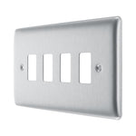 The BG RNBS4 is a 4 Gang Double Grid Front Plate in Brushed Steel Finish.